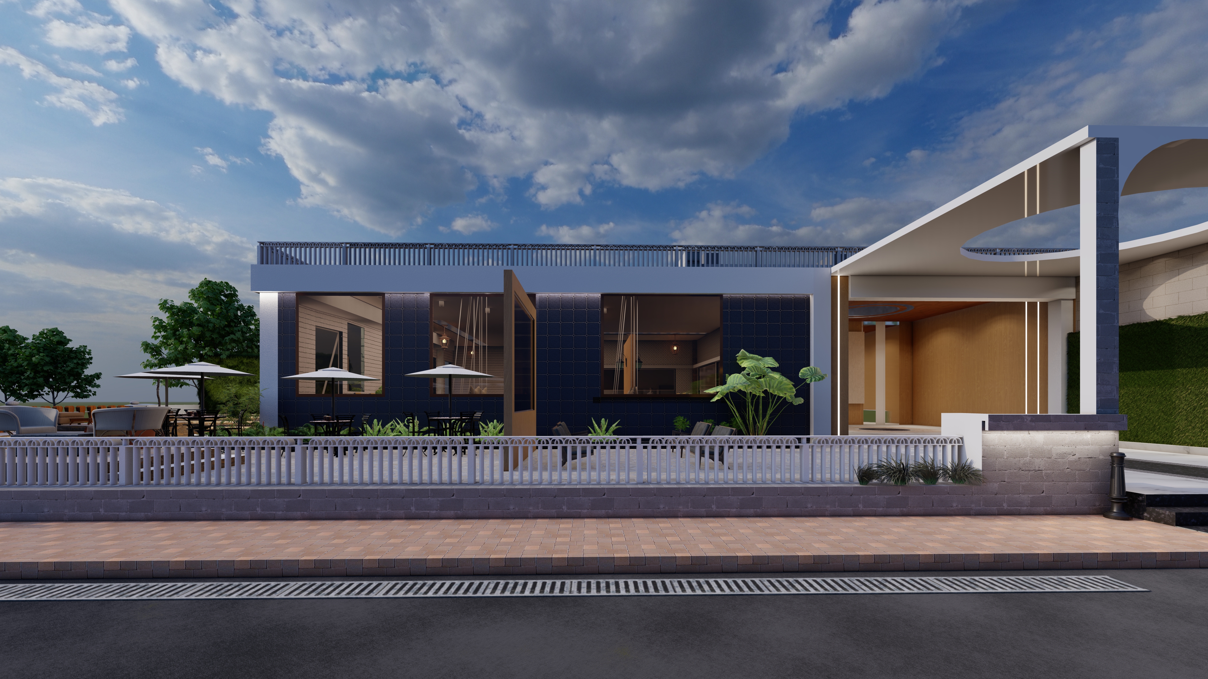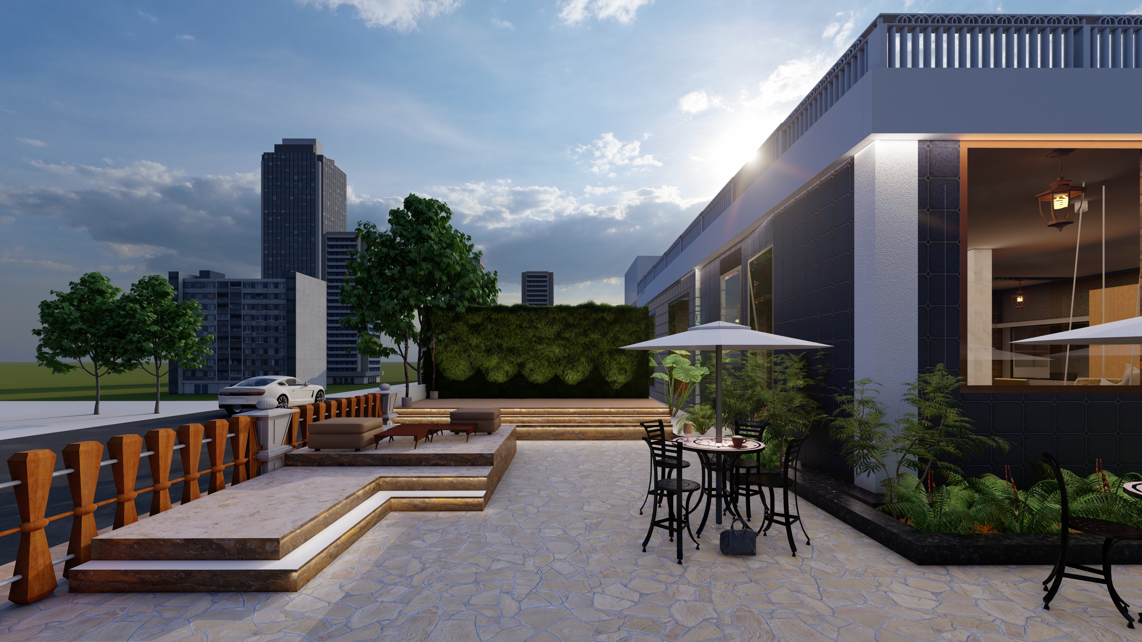 The space is an open-air patio, suggesting an emphasis on enjoying the outdoors while