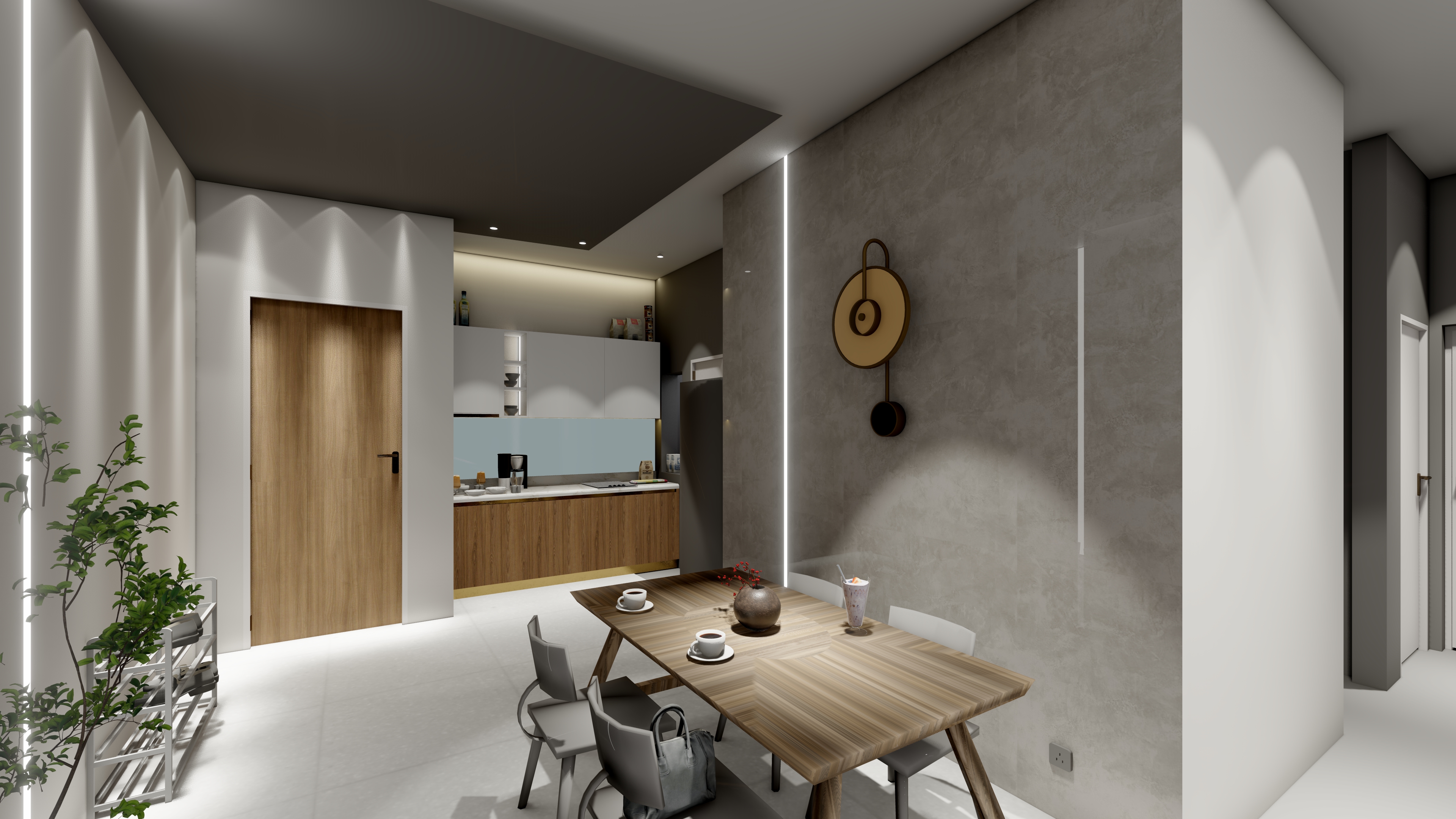 On the left wall, there is a minimalist wall clock with a circular design in black and gold tones. The wall has a textured finish, giving it a stylish look.