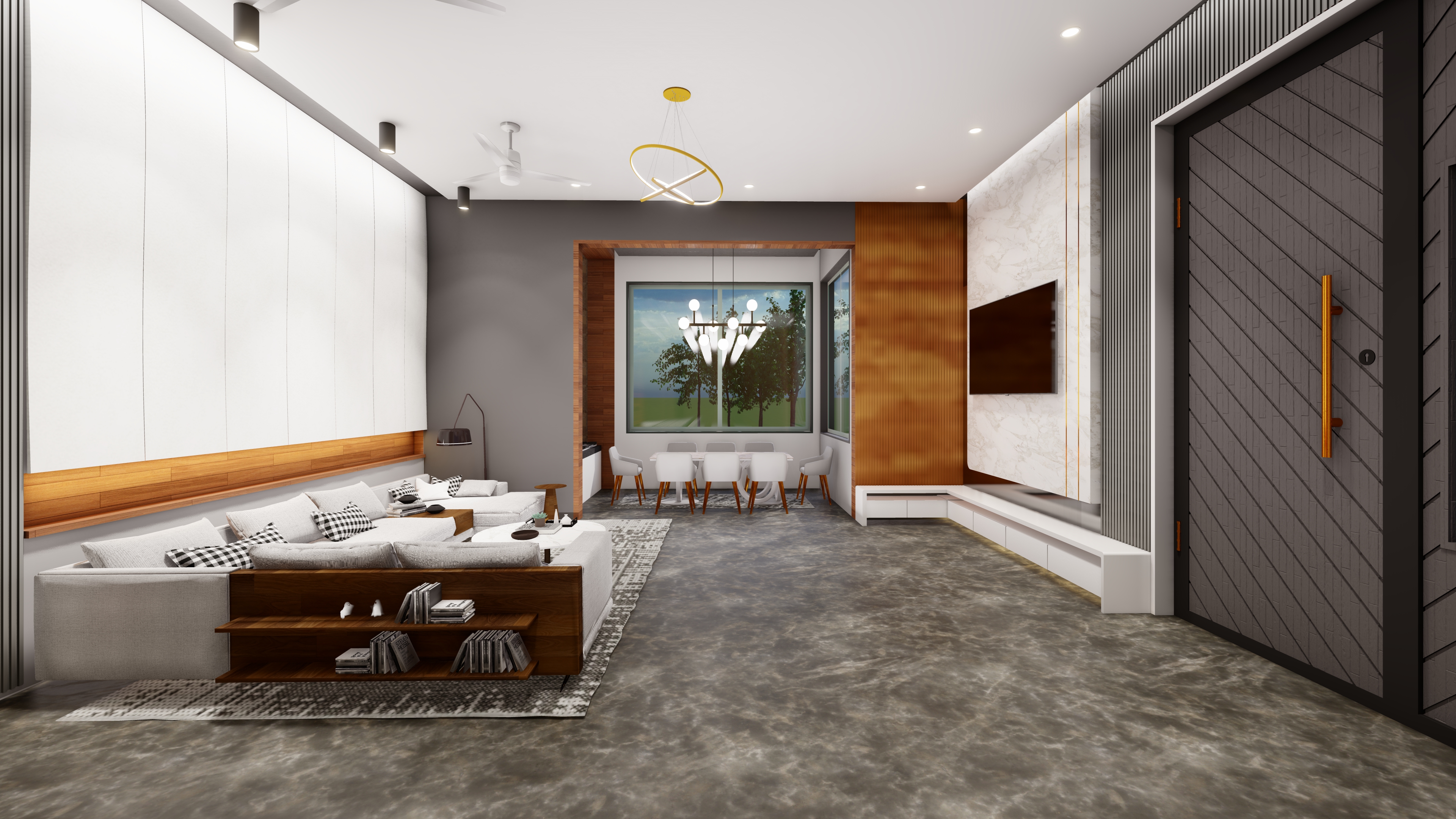 chandelier. The walls are a mix of white, grey, and wood tones, creating a warm and
