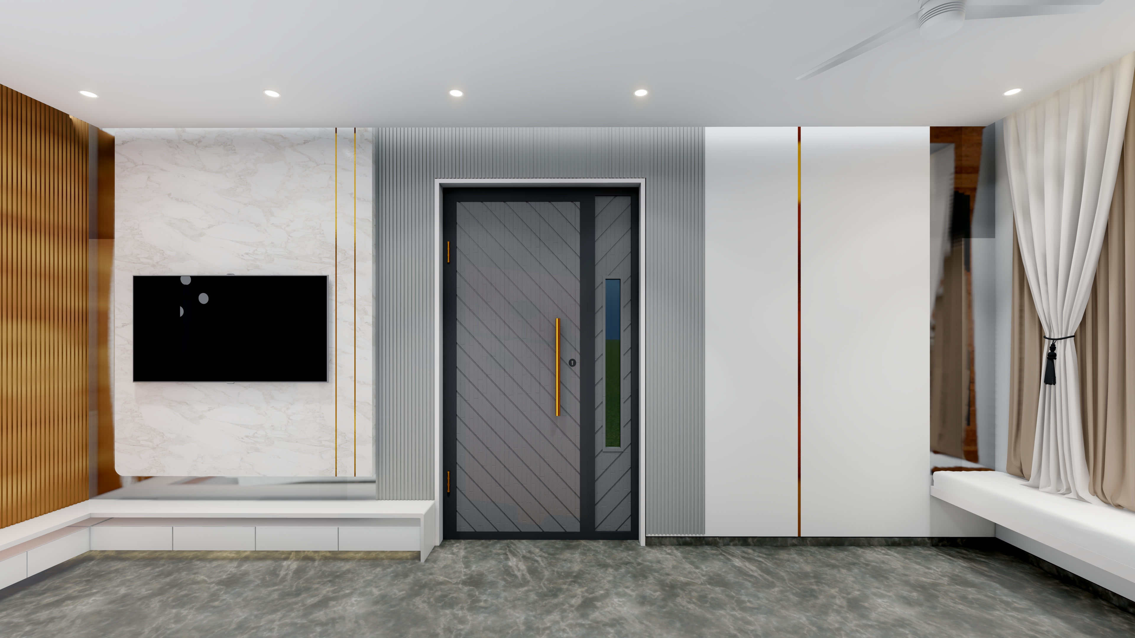 A modern entrance area with a stylish grey door featuring wooden accents and a vertical