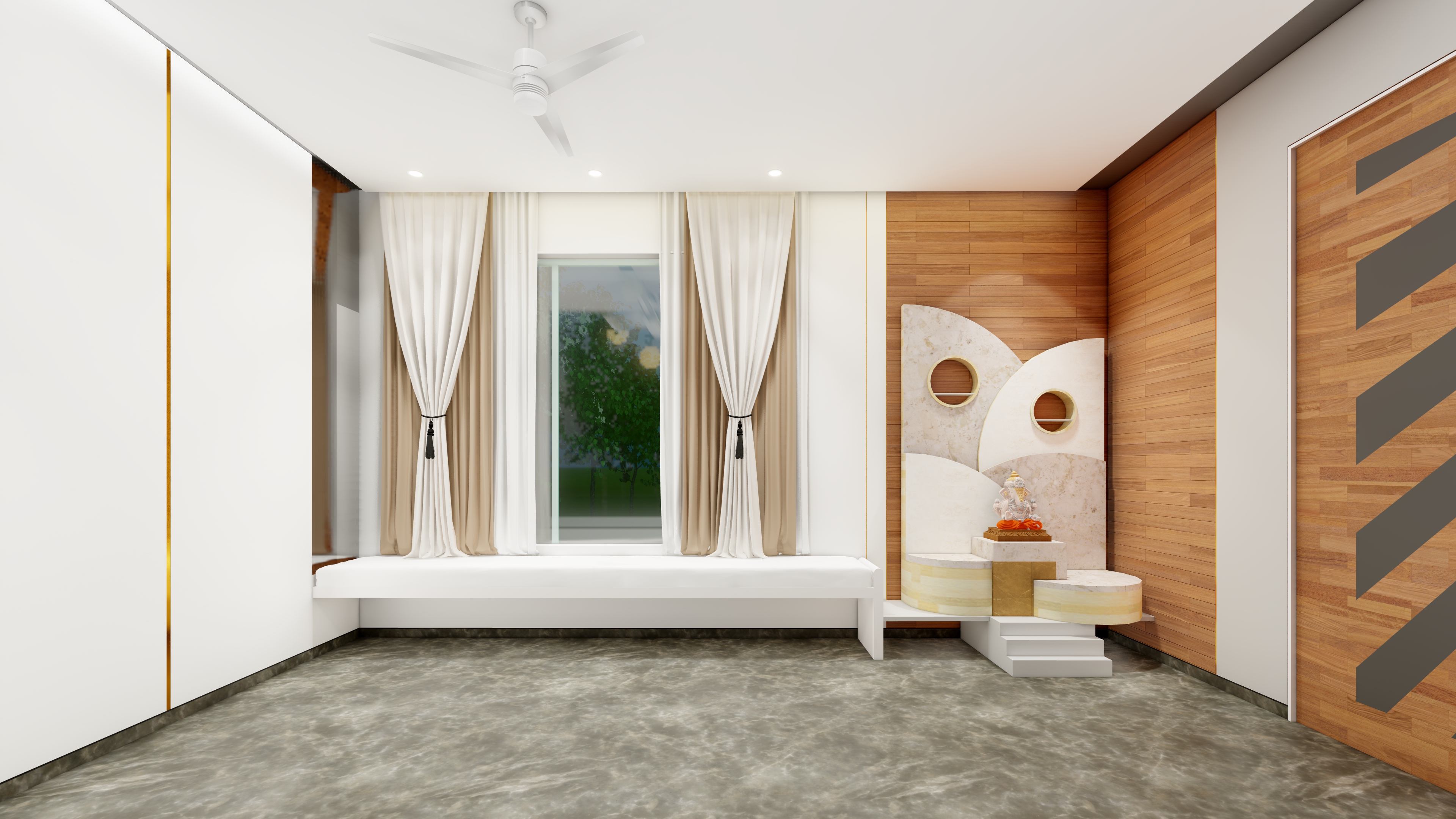 curtains. The space features a unique decorative wall with circular cutouts and wooden